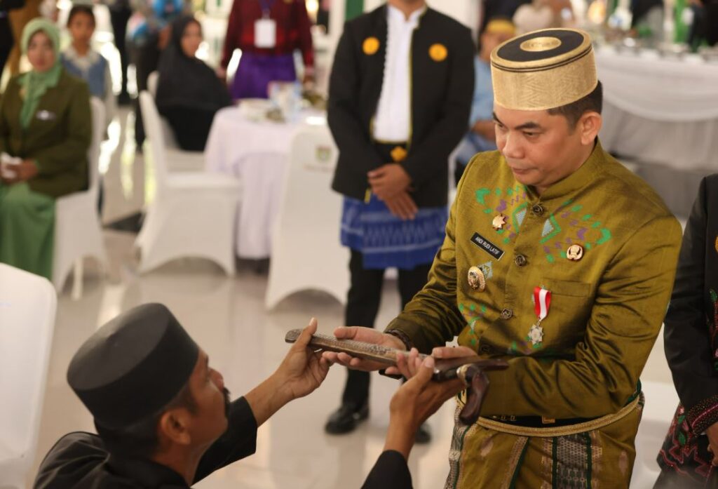 Komunitas Bugis Mantra Bumi juga menyerahkan senjata pusaka keris Tappi Lamba Pitu La Tenri Beta kepada Bang Arul, menambah kesan sakral pada momen tersebut.