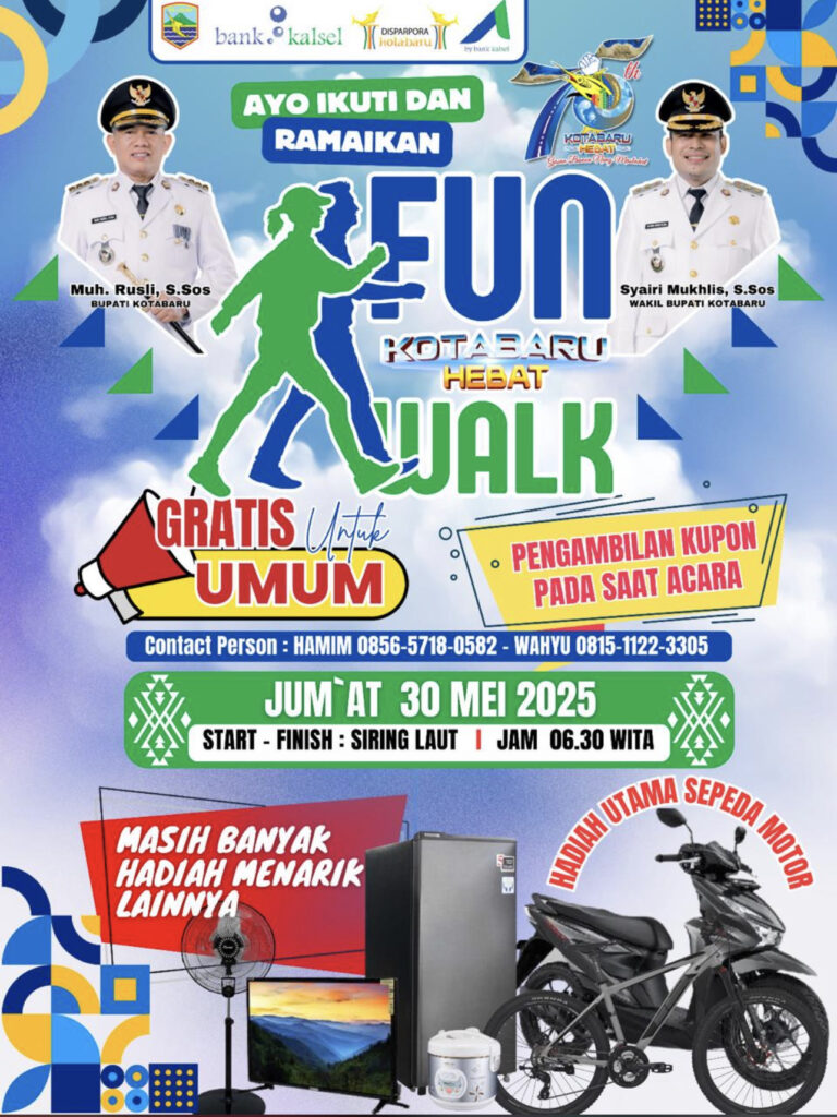 FaktaNow.com, Kotabaru – Pemerintah Kabupaten Kotabaru mengajak seluruh masyarakat untuk berpartisipasi dalam acara Fun Walk Kotabaru Hebat yang akan digelar pada Jumat, 30 Mei 2025. Kegiatan jalan sehat ini akan dimulai dan berakhir di Siring Laut dengan waktu mulai pukul 06.30 WITA.
