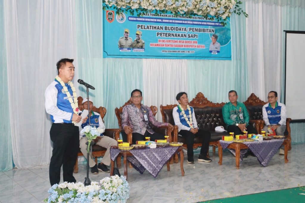 FaktaNow.com, Barito Kuala – Wakil Bupati Barito Kuala, Herman Susilo, resmi membuka pelatihan dan keterampilan usaha hewan ternak sapi yang digelar di Pemukiman Transmigrasi Desa Danda Jaya, Kecamatan Rantau Badauh, Kamis (22/5/2025). Pada kesempatan ini, dilakukan penyerahan bantuan sapi sebanyak 7 ekor dari Pemerintah Provinsi Kalimantan Selatan yang diserahkan oleh Kepala Dinas Tenaga Kerja dan Transmigrasi Provinsi, Irfan Sayuti.